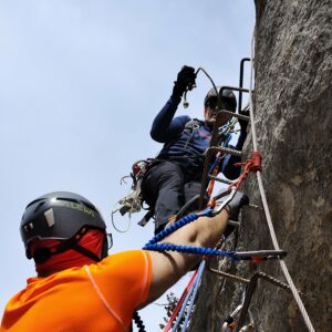 Uno de los pilares de nuestra formación es la seguridad. Todos nuestros TECNICOS son profesionales altamente cualificados, con amplia experiencia en montaña y en enseñanza técnica. Durante el curso, enseñamos a los alumnos a evaluar riesgos, interpretar el entorno, planificar una actividad y reaccionar correctamente ante situaciones imprevistas. Aprender a moverse en una vía ferrata no solo significa avanzar por el cable de vida, sino también entender el entorno y tomar decisiones responsables.